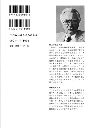 本書は、みずからユダヤ人としてアウシュヴィッツに囚われ、奇蹟的に生還した著者の「強制収容所における一心理学者の体験」(原題)である。「この本は冷 静な心理学者の眼でみられた、限界状況における人間の姿の記録である。そしてそこには、人間の精神の高さと人間の善意への限りない信仰があふれている。だ がまたそれは、まだ生々しい現代史の断面であり、政治や戦争の病誌である。そしてこの病誌はまた別な形で繰り返されないと誰がいえよう」(「訳者あとが き」より)。