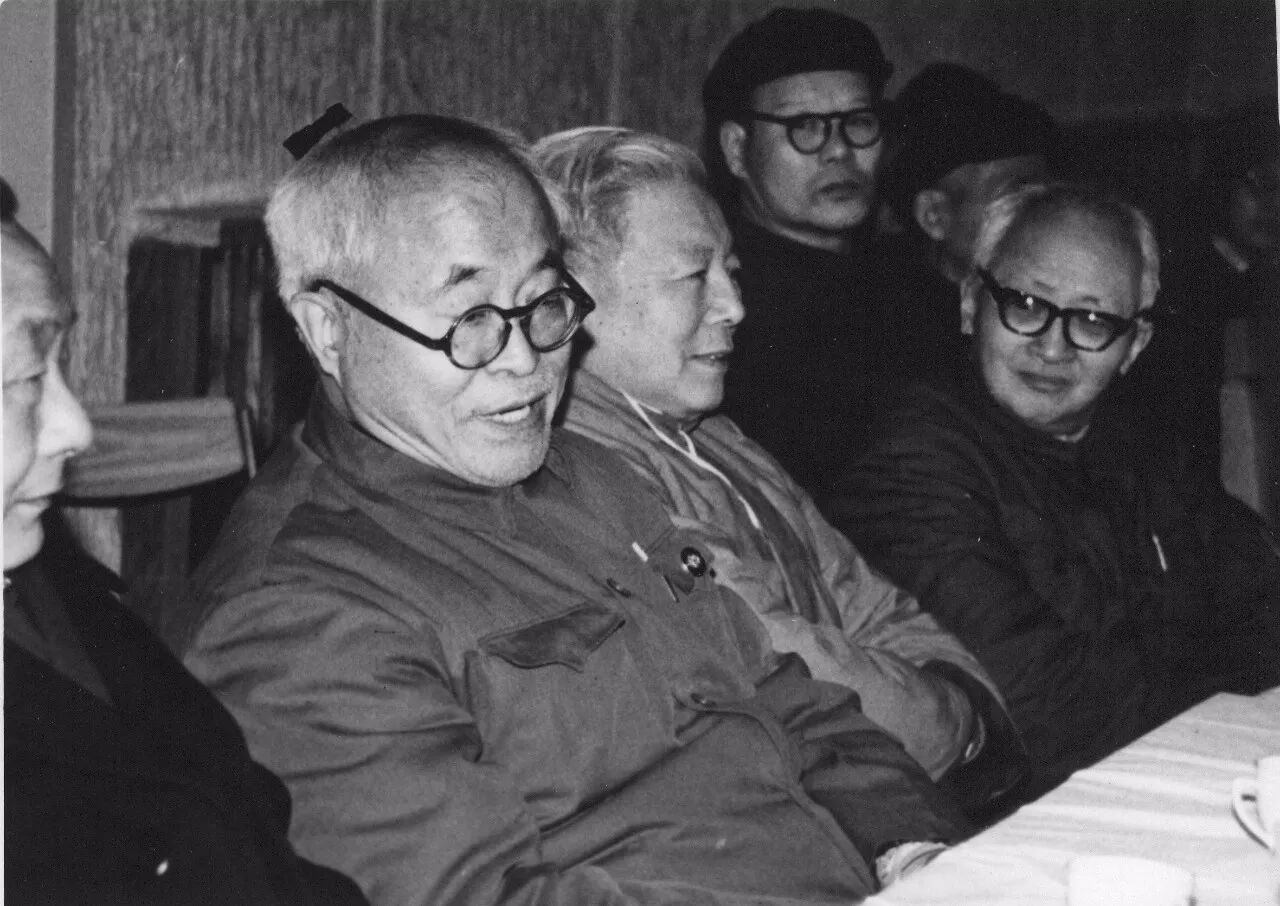 張政烺先生同蔡美彪、週一良、何茲全等先生在某次會場,約1980年代。前排左起:蔡美彪、張政烺、何茲全、週一良。